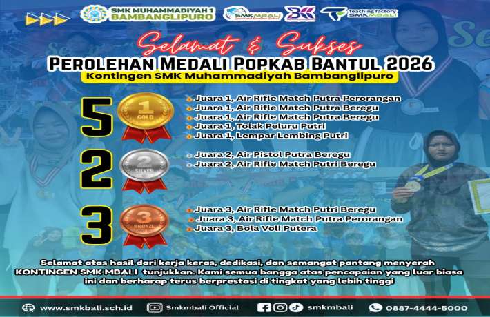 Kontingen SMK Muhammadiyah Bambanglipuro berhasil menorehkan prestasi membanggakan dalam ajang Pekan Olahraga Pelajar Kabupaten (POPKAB) Bantul 2026. Melalui berbagai cabang olahraga yang diikuti, SMK MBALI menunjukkan capaian luar biasa dengan perolehan medali yang membanggakan.